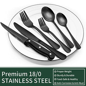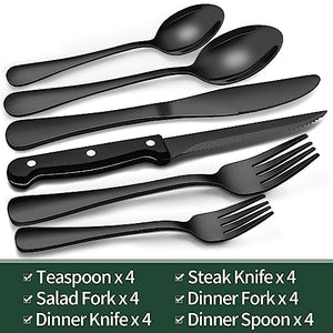 EWFEN 24-Piece Black Silverware Set with Steak Knives. Flatware for 4. Food-Grade Stainless Steel Tableware Cutlery Set. Mirror Finished Utensil Sets Home Restaurant