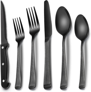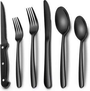- COMFORTABLE DESIGN: This flatware set has a classic silhouette with clean lines and polish-finish surface in all black. a good choice to go with your existing tableware. The smooth edge of the handle is pleasure to hold. appropriate weight and perfect balance are added to ensure maximum comfort during use.