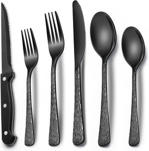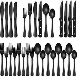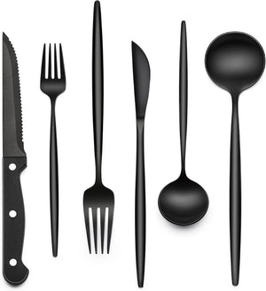 - COMFORTABLE DESIGN: This flatware set has a classic silhouette with clean lines and polish-finish surface in all black. a good choice to go with your existing tableware. The smooth edge of the handle is pleasure to hold. appropriate weight and perfect balance are added to ensure maximum comfort during use.