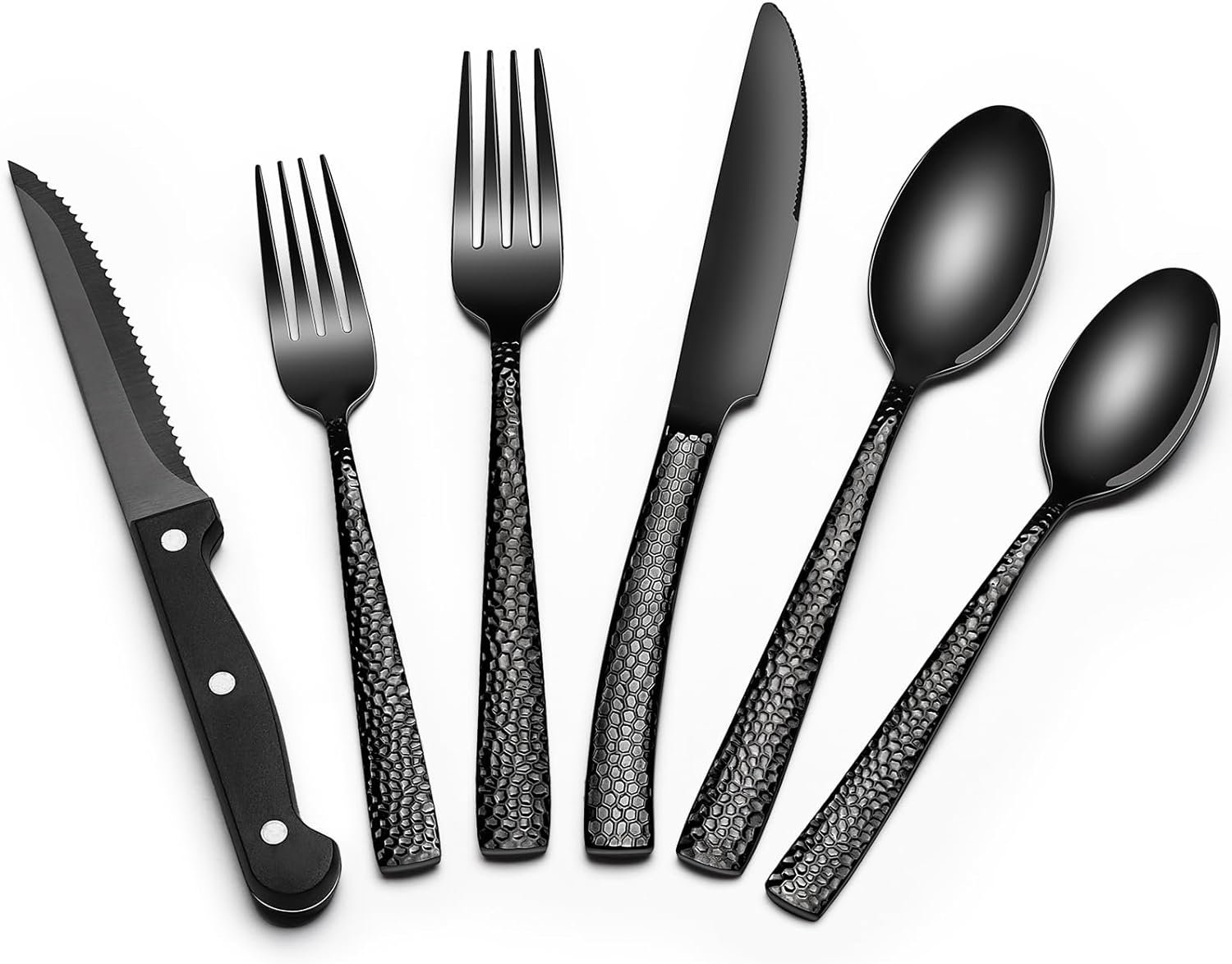 EWFEN 24-Piece Black Silverware Set with Steak Knives. Flatware for 4. Food-Grade Stainless Steel Tableware Cutlery Set. Mirror Finished Utensil Sets Home Restaurant