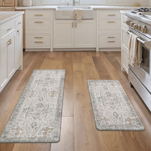 GENIMO Kitchen Mats for Floor 2PCs. Washable Anti Fatigue Mat for Cushioned. 17.3x47+17.3x30. Waterproof Kitchen Rugs. Non Slip Comfort Standing Mat Rug for Home. Sink. Laundry. LightTaupeBrown