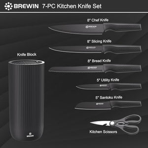 - PERFECT ALL-IN-ONE SET - Brewin kitchen knife set includes 1 x 8 chef knife. 1 x 8 slicing knife. 1 x 8 bread knife. 1 x 5 utility knife. 1 x 5 Santoku knife. 1 x kitchen scissors. 1 x universal knife block. Germain 1.4116 stainless steel. Aesthetic design. Brewin knife set meets all your kitchen works.