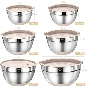 Mixing Bowls with Airtight Lids Set. 26PCS Stainless Steel Khaki Bowls with Grater Attachments. Non-Slip Bottoms & Kitchen Gadgets Set. Size 7. 4. 2.5. 2.0.1.5. 1QT. Great for Mixing & Serving