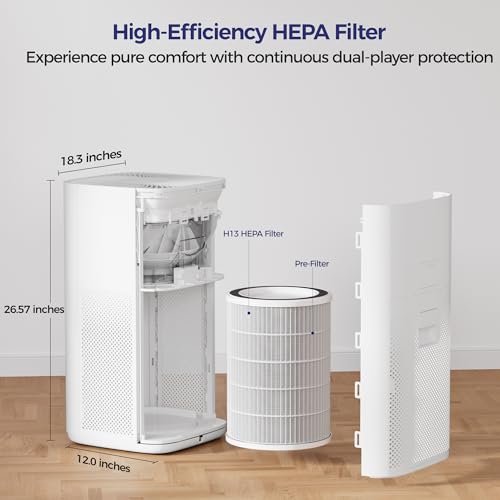 - Advanced H13 HEPA Filtration System: This high-efficiency air purifier is equipped with a cleanable pre-filter and H13-grade HEPA filter. effectively capturing 99.97% of airborne particles such as dust. smoke. pollen. hair. and pet dander. Perfect as an air purifier for pets. sensitivities. or everyday use