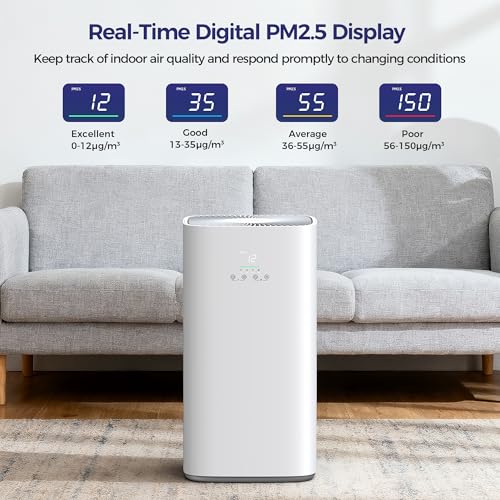 - Real-Time Air Quality Monitoring: Featuring a color-coded light ring and digital air quality display. this HEPA air purifier continuously reports indoor air status. In Auto Mode. the fan speed automatically adjusts to current air conditions. ensuring consistent and hands-free purification