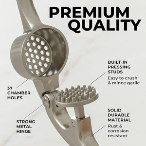- MULTI-PURPOSE TOOL: Don't have a mortar and pestle? Fill the garlic mincer tool with coriander seeds. cumin seeds. or peppercorns when any recipe calls for freshly cracked or coarsely ground seeds. This garlic presser can also be used as a ginger press tool or to crush onions or nuts. Simply fill the chamber and squeeze to crush.